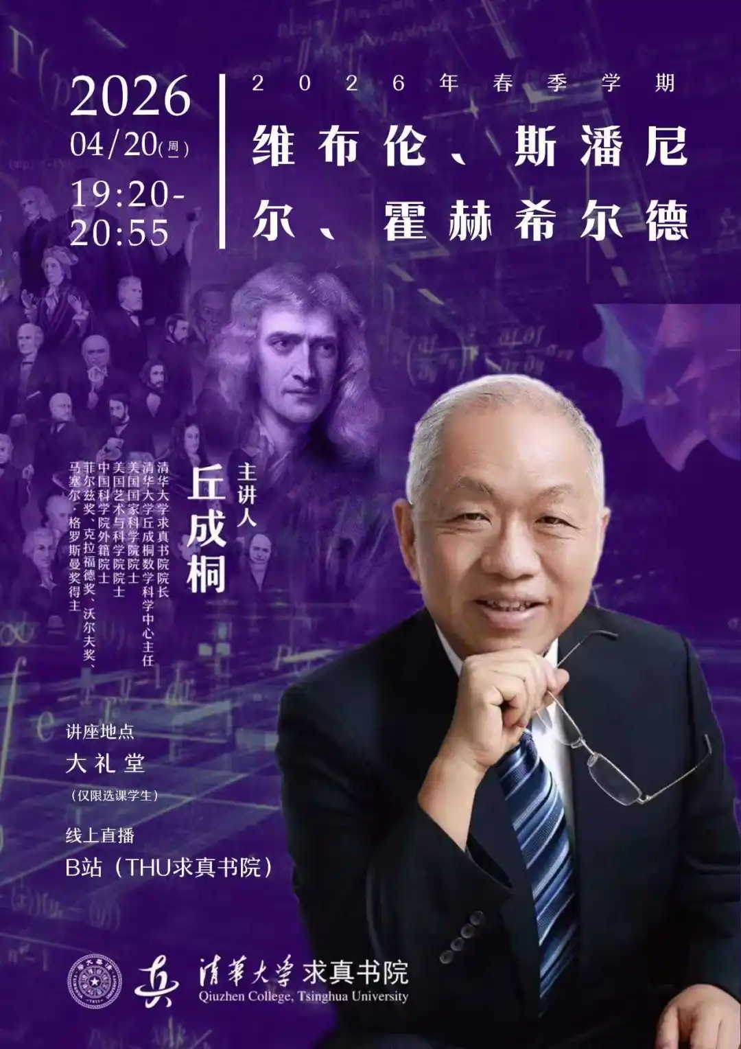 本周的数学史课堂上,丘成桐先生将为获得第五届黄播 pi节挑战赛“最佳命题奖”的求真学生颁发证书,并宣布获得优异成绩的参赛中学名单。